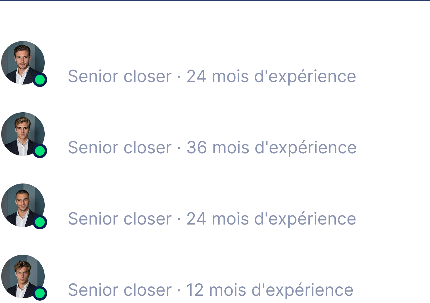Un closer sénior assigné à votre compte. Il connaît vos commerciaux, vos zones, vos critères.