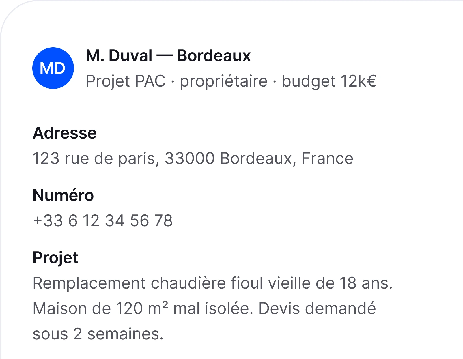 Avant chaque RDV, votre commercial reçoit une fiche complète.